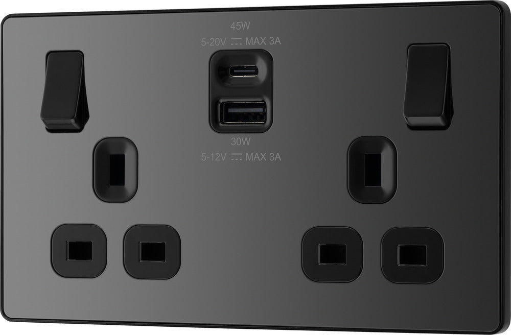 BG Evolve PCDBC22UAC45B 13A Double Switched Power Socket + USB A+C (45W) - Black Chrome (Black)