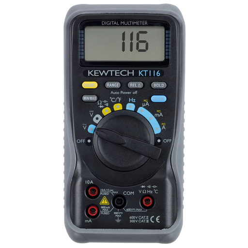 Kewtech KT116 Digital Multimeter AC/DC 600V, 10A, with temp. inc thermocouple Features: Measures AC/DC current up to 10A Measures AC/DC voltage up...