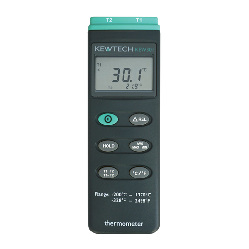 Kewtech KEW301 Digital Dual Input Thermometer -200 to 1370 degree C Key Benefits: Complies to IEC801-2 Auto power off Temperature indication follo...