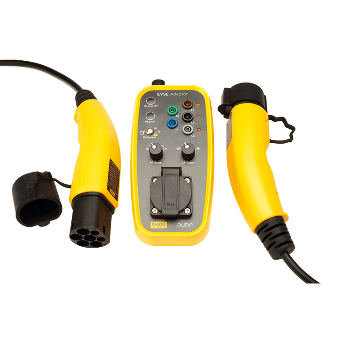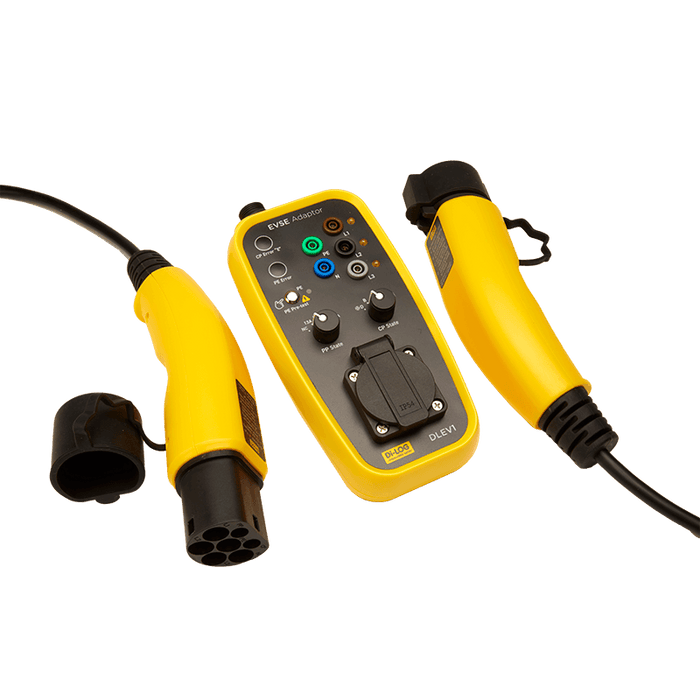 The DLEV1 is a universal EVSE Charge Station Adaptor Kit that will simulate the Proximity Pilot (PP) States and Control Pilot (CP) States required to energise a free-standing or wall-mounted EV charge station. Supplied with a type 1 and type 2 connector plug specifically designed for testing, the DLEV1 kit will also simulate PE Pre-test, CP Error “E” and PE Error with the added feature of CP signal output and load connection
