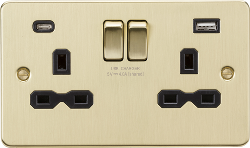 Knightsbridge FPR9940BB Flat Plate 13A 2G SP Switched Socket + Dual USB A & C (5V DC 4.0A Shared) – Brushed Brass with Black Insert Upgrade you...