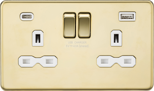 Knightsbridge SFR9940PBW Screwless 13A Double Switched Socket with Dual USB A+C (5V DC 4.0A Shared) – Polished Brass & White Insert Enhance yo...