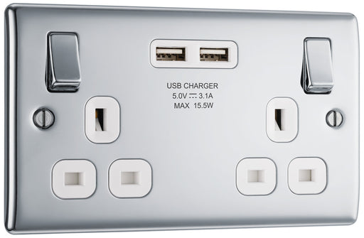 BG NPC22U3W Nexus Metal Double Socket + 2x USB - White Insert - Polished Chrome