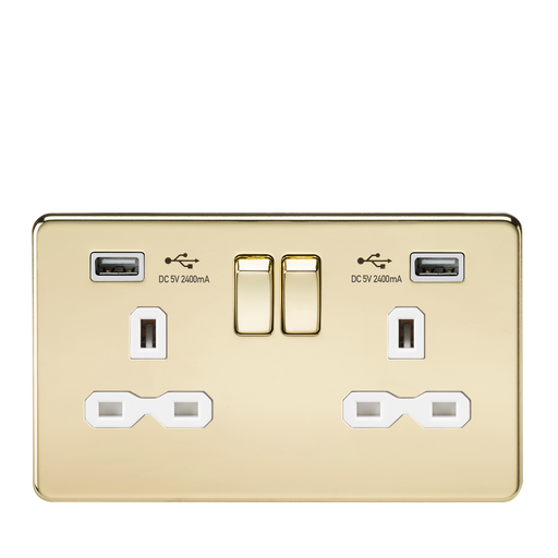 Knightsbridge SFR9224PBW Screwless 13A 2G Switch Socket + 2xUSB 2.4A - Polished Brass + White Insert