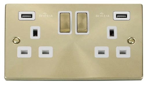 Click Deco VPSB580WH Victorian 13A Ingot 2G Switched Socket + 2x2.1A USB - Satin Brass (White)