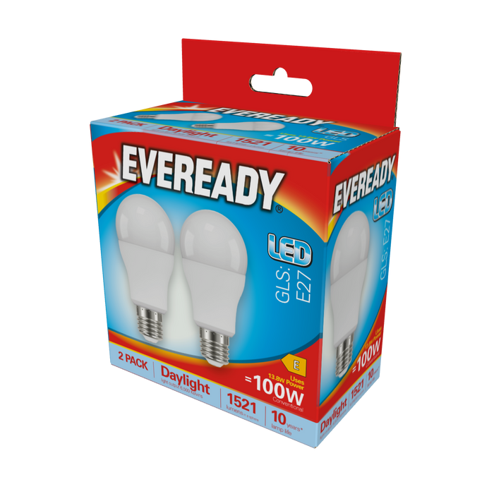 Eveready S15308 E27 ES GLS LED Bulb Opal 13.8W 1521lm Daylight 6500K (2 Pack)