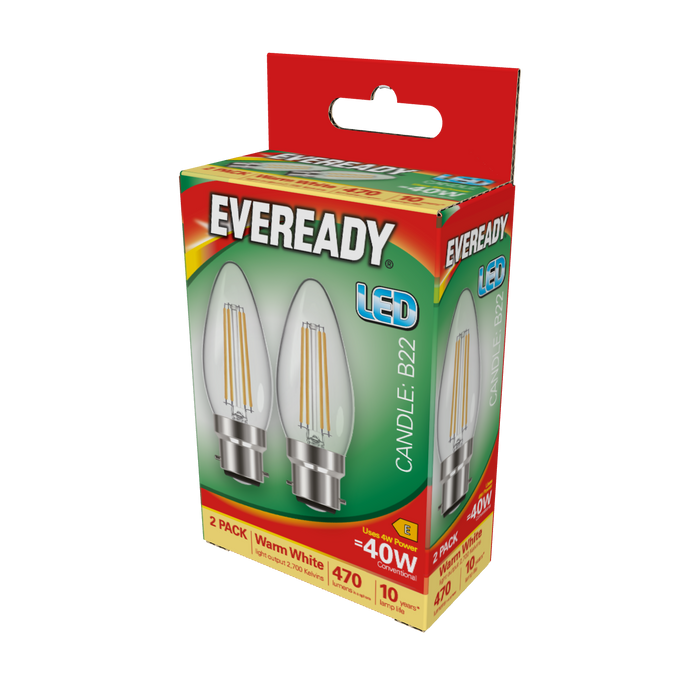 Eveready S17394 B22 BC Candle Filament Clear LED Bulb 4W 470lm Warm White 2700K (2 Pack)