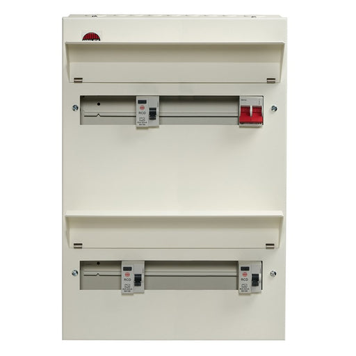 Wylex 26 Way Duplex High Integrity + 100A Main Switch, 2x80A 30mA Type A RCD Features Full metal duplex enclosure Fixed busbar assembly 26W Hig...