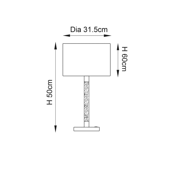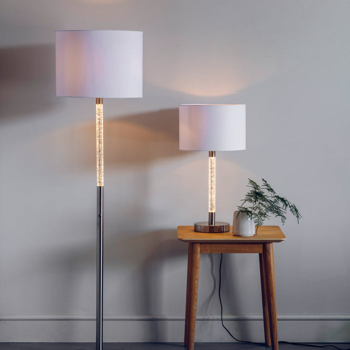 Product DescriptionThe Andromeda table light is a stylish fitting with clean lines finished in satin chrome plate. It features a clear acrylic section to the base, with a bubble effect which creates a beautiful effect from an additional LED light source. Supplied with a fabric shade, both the stem and main lamp can be lit separately or together. Compatible with LED lamps and matching items available.