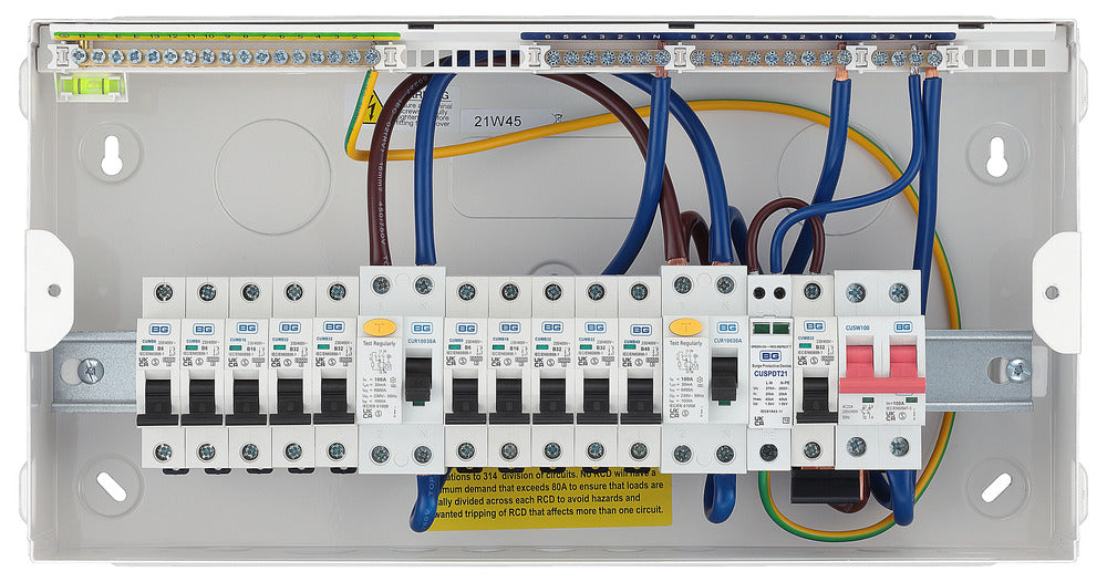 BG CFUDP1000011ASPD 19 Module 11 Way Populated + 100A Switch, 2x100A Type A 30mA RCD, SPD, 32A MCB & 10xMCBs