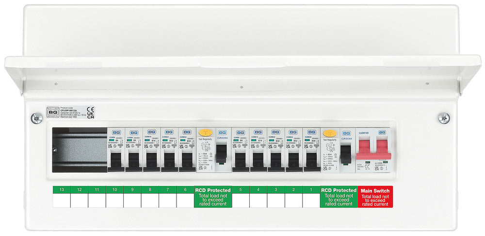 BG CFUDP16613A BG 19 Module 13 Way Populated + 100A Switch, 2x63A Type A 30mA RCD & 10xMCBs