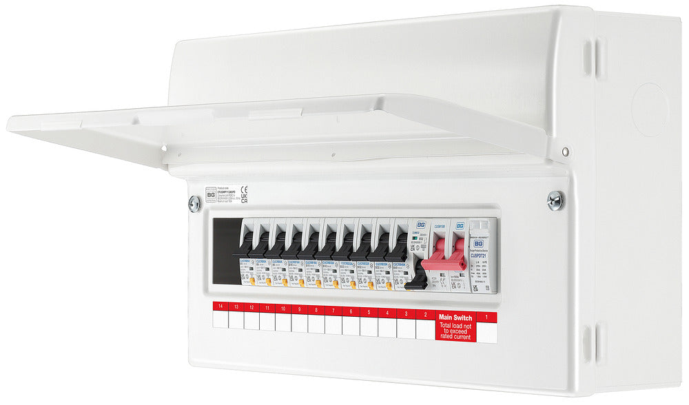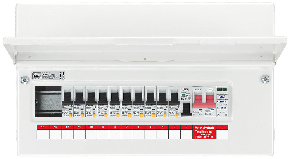BG CFUSWP112ASPD 16 Module 12 Way Metal Populated Consumer Unit + 100A Main Switch, 10x Type A RCBOs, 1x SPD & 1x 32A MCB