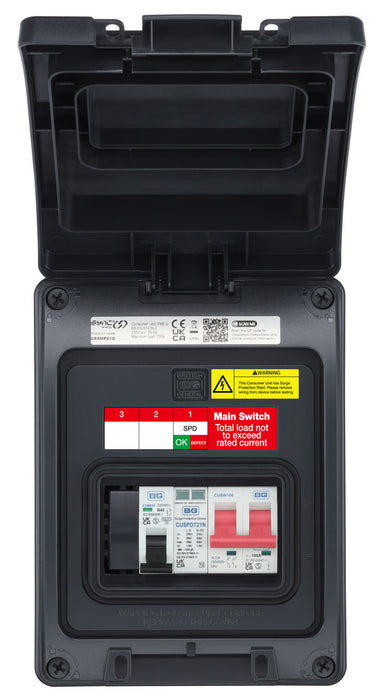 BG CP5MPS1G 5 Module IP66 Weatherproof Grey Plastic EV Charger Circuit Protection with 100A Main Switch, 40A B Curve MCB & Type 2 SPD