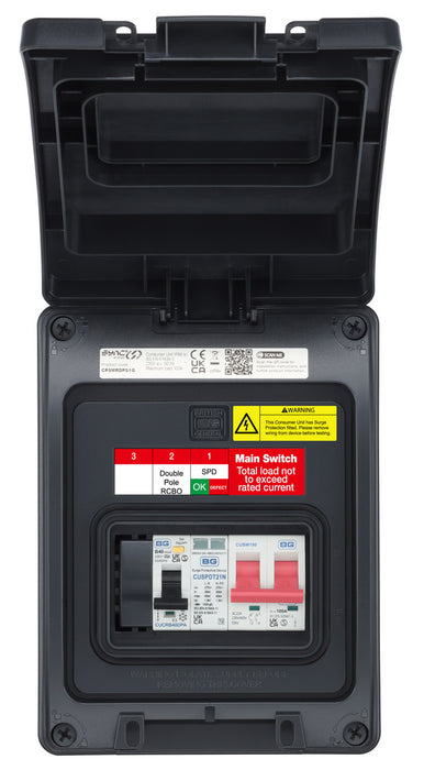 BG CP5MRDPS1G 5 Module IP66 Weatherproof Grey Plastic EV Charger Circuit Protection with 100A Main Switch, 40A 30mA Type A DP RCBO & Type 2 SPD