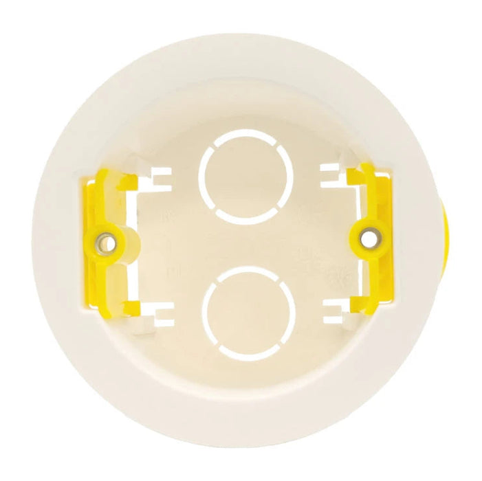 The Deta TDL3500 Tower Round 35mm Fast Fix Dry Lining Box is expertly designed for the flush mounting of round ceiling accessories and smoke alarms. Built for convenience and durability, it features pivoting fast-fit lugs to simplify installation and ensure a secure fit in plasterboard ceilings.