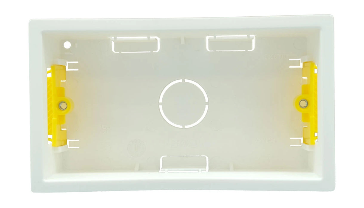 The Deta TDL3502 dry lining box is ideal for residential and commercial use where double-gang accessories such as twin sockets or two-way switch units need to be flush mounted into plasterboard or hollow wall surfaces.