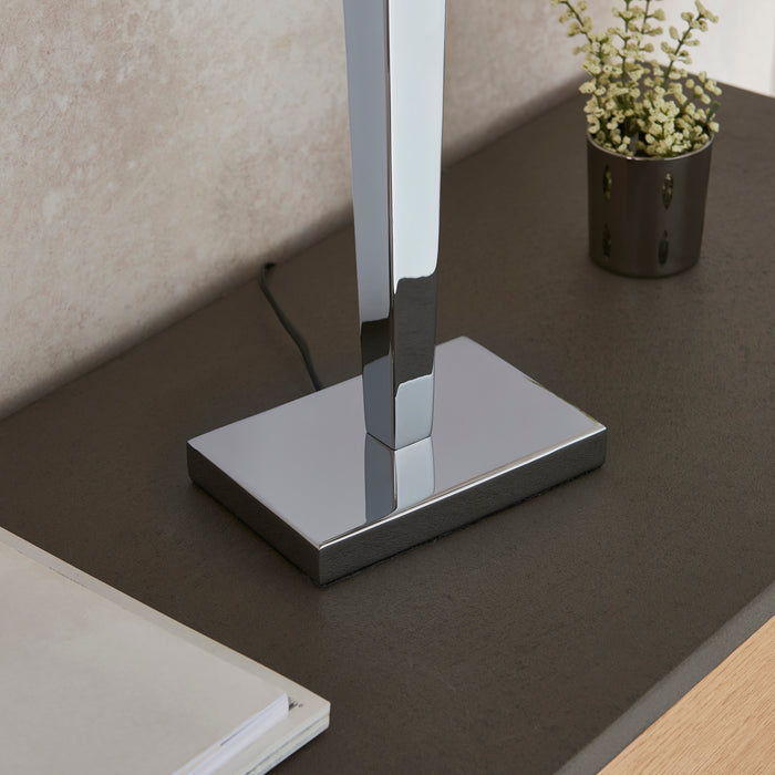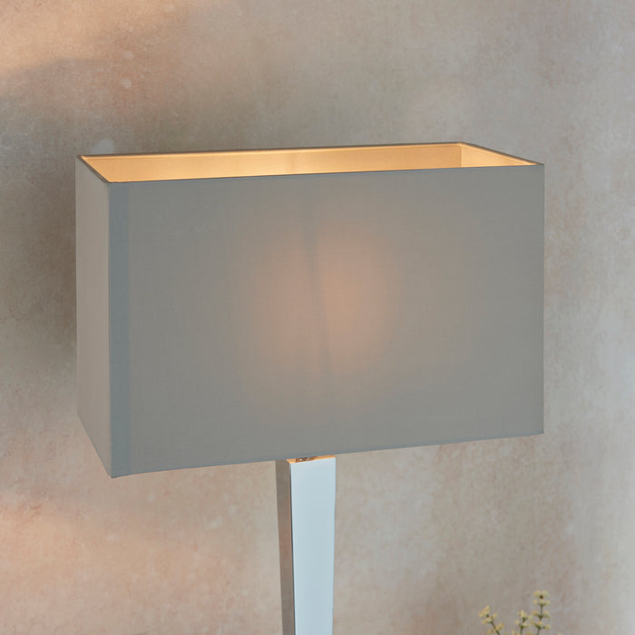 Product DescriptionThis table lamp has a tapered chrome effect plated stem, complete with a rectangular grey faux silk shade. Suitable for use with LED lamps and supplied with inline switch. Matching wall light available