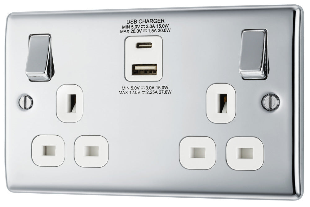 BG NPC22UAC30W Nexus Metal 13A Double Socket + USB A+C (30W) - White Insert - Polished Chrome
