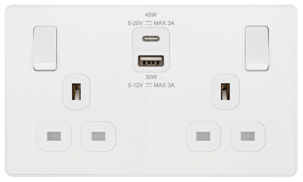 BG Evolve PCDCL22UAC45W 13A Double Switched Power Socket + USB A+C (45W) - Pearlescent White (White)