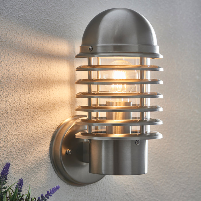 Product DescriptionThe Louvre outdoor wall light is constructed from stainless steel and polycarbonate with an IP44 rating, and fitted with vandal resistant diffusers making it suitable for front gardens and commercial properties. Dimmable and suitable for use with LED lamps. Matching products available.